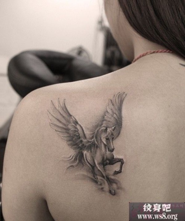 女生后背经典黑白天马_黑白纹身图案大全_纹身图吧