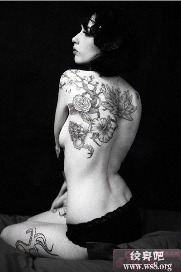 女生背上创意黑白花与树纹身_黑白纹身图案大全_纹身图吧