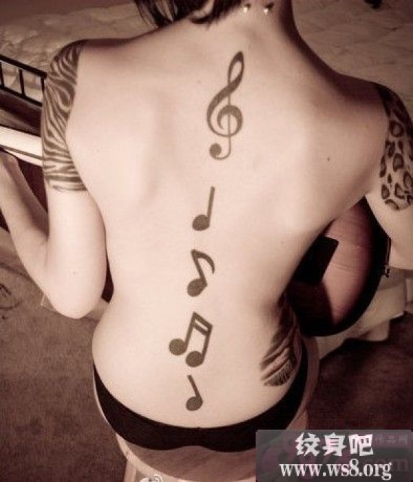 女生背上个性黑白音符纹身_黑白纹身图案大全_纹身图吧