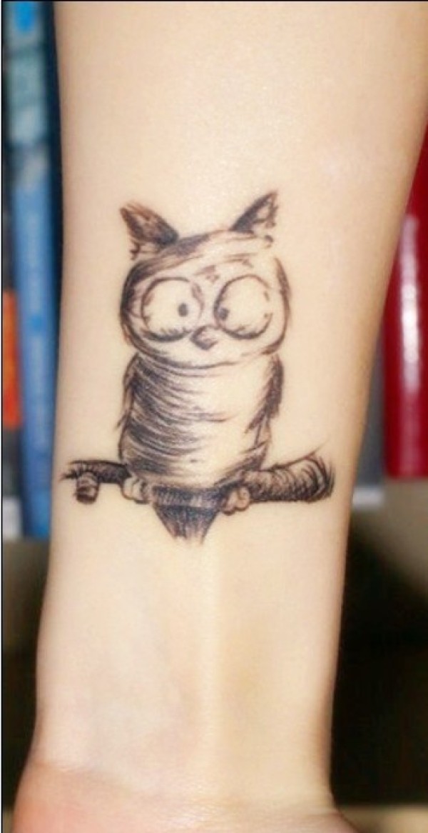 手臂黑白个性猫头鹰可爱纹身图片_黑白纹身图案大全_纹身图吧