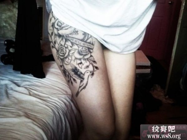 女生大腿黑白玫瑰纹身图案_黑白纹身图案大全_纹身图吧