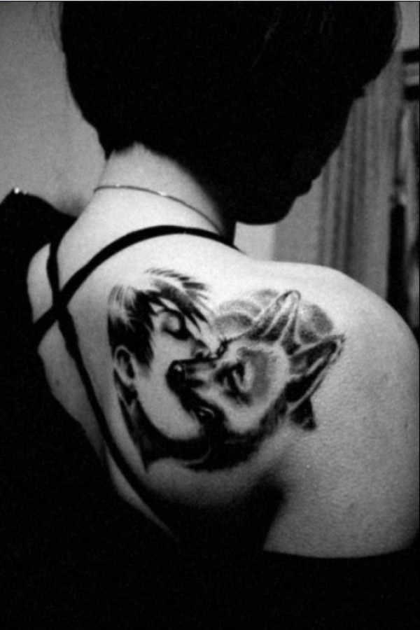 女性背部黑白肖像狼图腾创意刺青_黑白纹身图案大全_纹身图吧