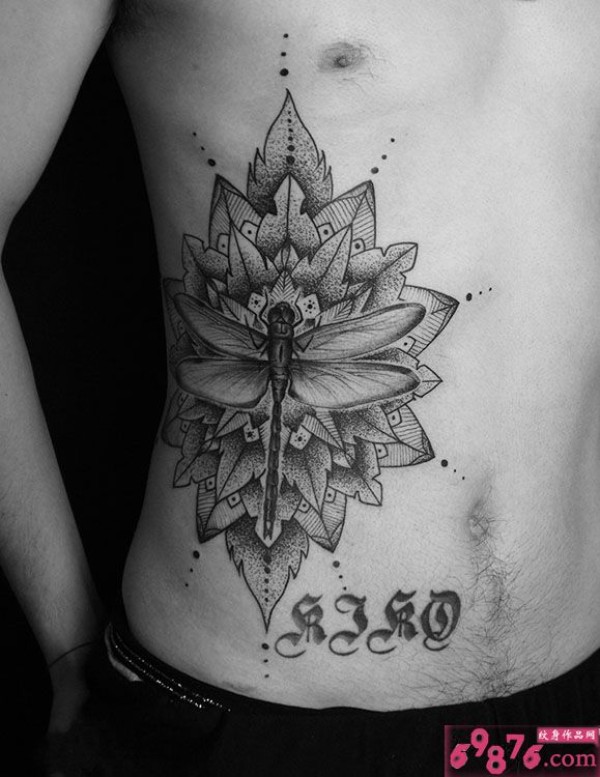 艺术梵花蜻蜓黑白腰侧纹身_黑白纹身图案大全_纹身图吧