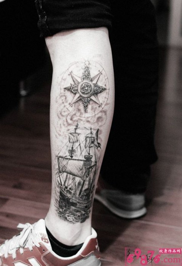 指南针与航行帆船黑白小腿纹身_黑白纹身图案大全_纹身图吧