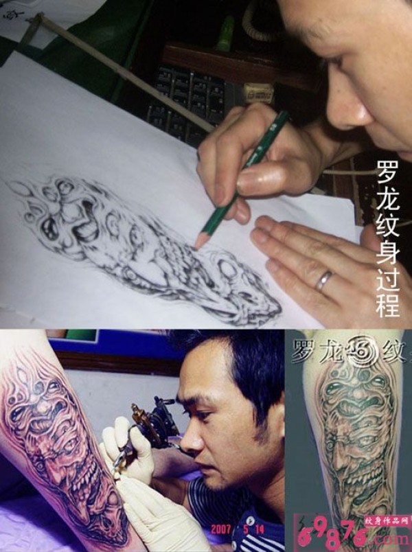 一组满背大气九龙拉棺纹身图案作品和手稿