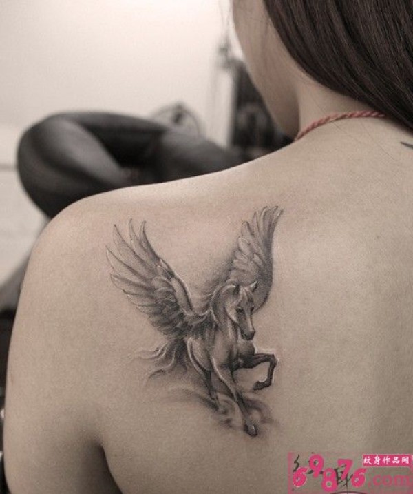 女生后背经典黑白天马_黑白纹身图案大全_纹身图吧