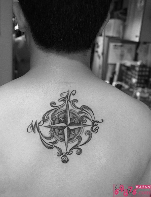 男人背上黑白指南针刺青_黑白纹身图案大全_纹身图吧