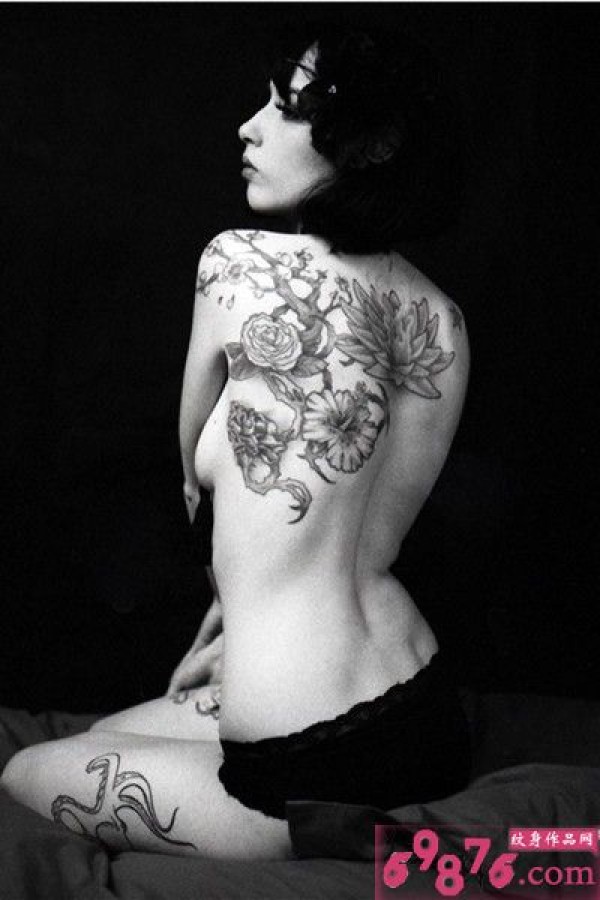女生背上创意黑白花与树纹身_黑白纹身图案大全_纹身图吧