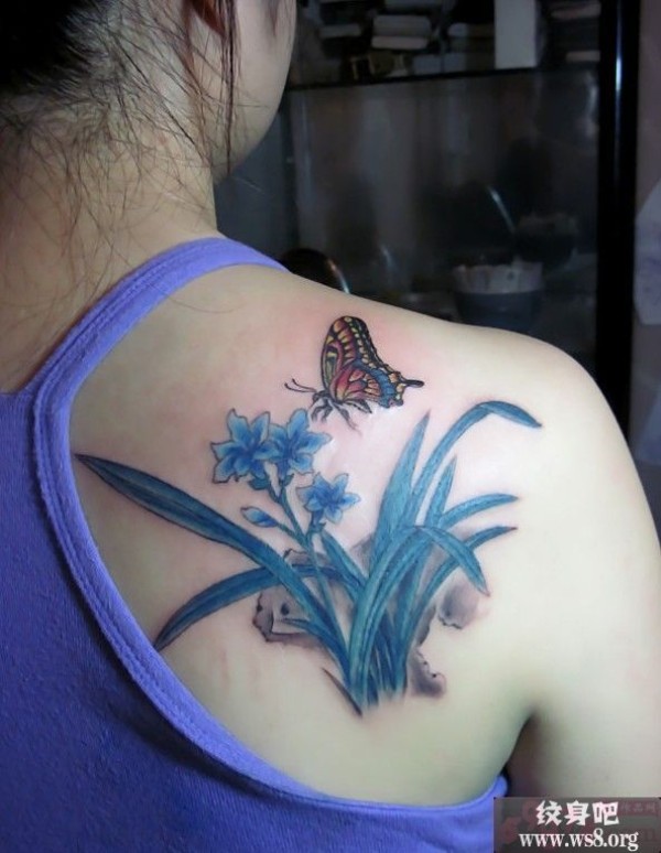 蝴蝶水仙花后肩纹身图案_蝴蝶纹身图案大全_纹身图吧