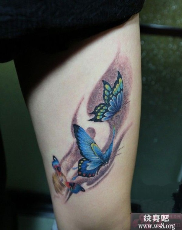 大腿飞舞蝴蝶时尚刺青图案_蝴蝶纹身图案大全_纹身图吧