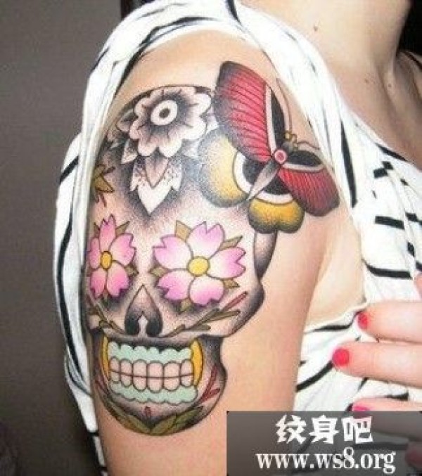 美女手臂墨西哥骷髅头蝴蝶刺青纹身图案_蝴蝶纹身图案大全_纹身图吧