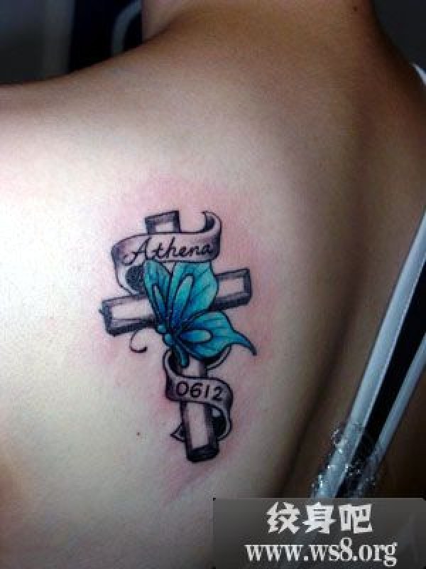 后肩十字架蝴蝶时尚纹身图案_蝴蝶纹身图案大全_纹身图吧