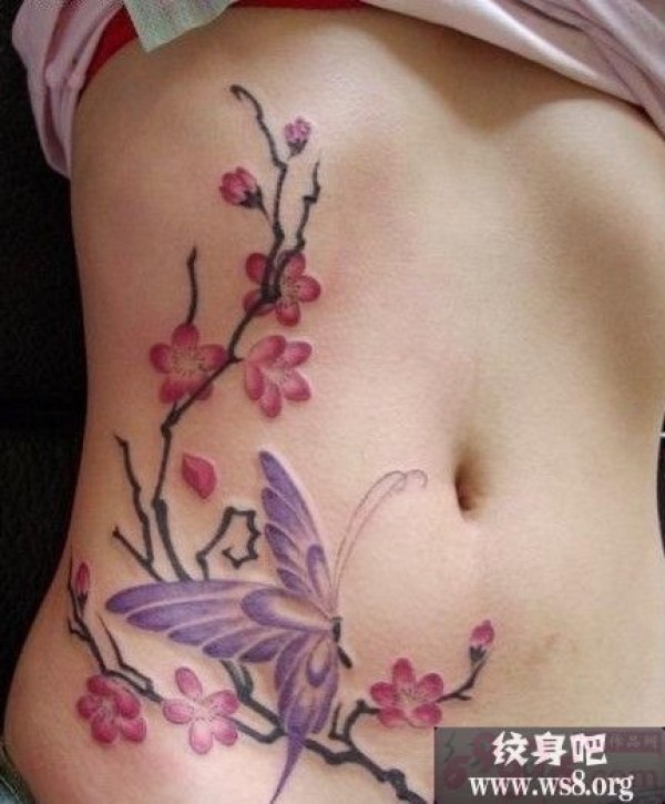 美女腹部梅花蝴蝶纹身图案_蝴蝶纹身图案大全_纹身图吧