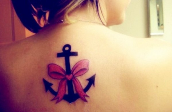 女性背部彩色蝴蝶结锚欧美独特刺青_蝴蝶纹身图案大全_纹身图吧