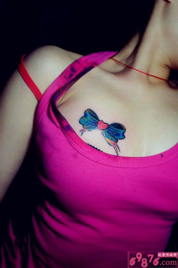 胸前彩色蝴蝶结纹身_蝴蝶纹身图案大全_纹身图吧