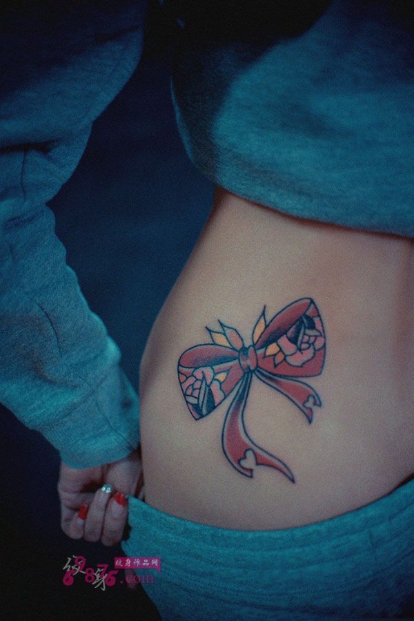 美女侧腰粉色蝴蝶结纹身_蝴蝶纹身图案大全_纹身图吧