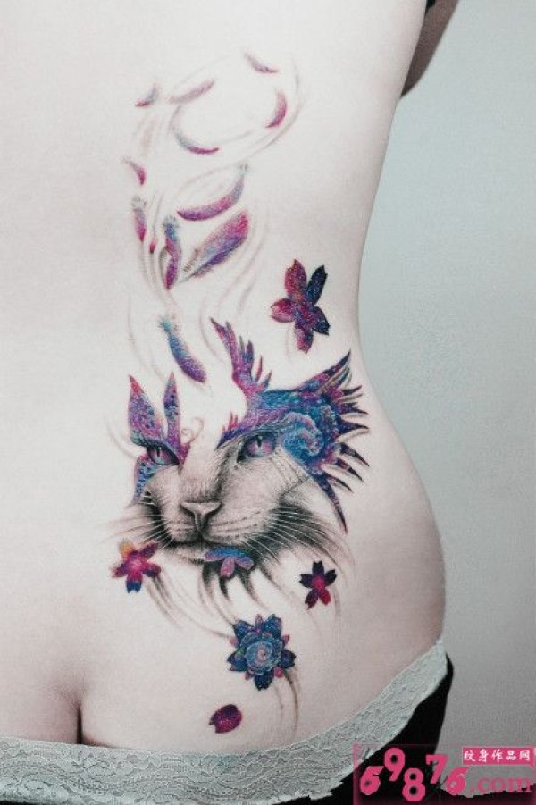 后腰创意飞舞蝴蝶与猫纹身_蝴蝶纹身图案大全_纹身图吧