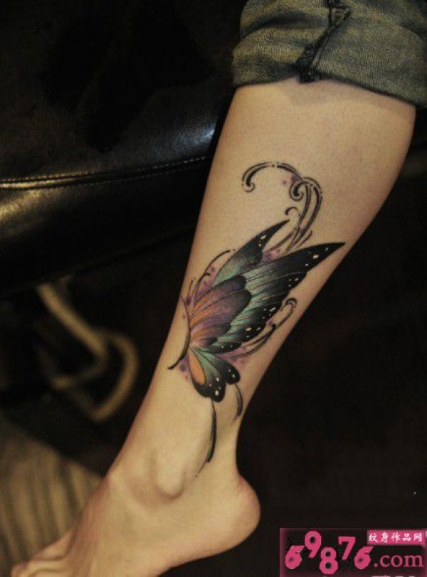 美丽花蝴蝶小腿纹身_蝴蝶纹身图案大全_纹身图吧