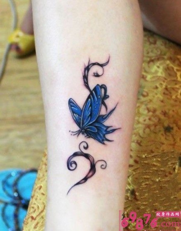 女孩小腿蓝色蝴蝶纹身_蝴蝶纹身图案大全_纹身图吧