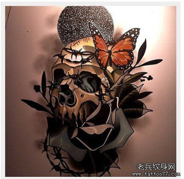 一款彩色欧美骷髅蝴蝶纹身图案_蝴蝶纹身图案大全_纹身图吧