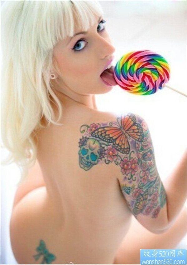 一幅女生肩部骷髅蝴蝶纹身图案_蝴蝶纹身图案大全_纹身图吧