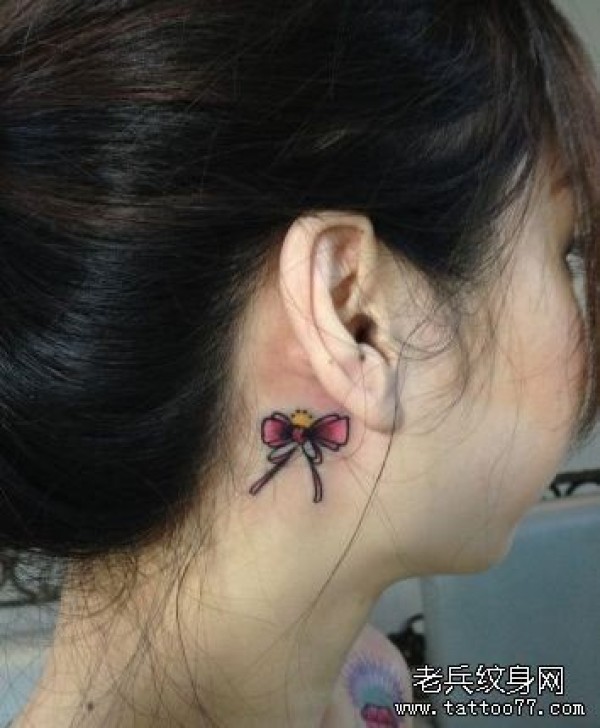 女孩子耳部小巧流行的蝴蝶结纹身图片_蝴蝶纹身图案大全_纹身图吧