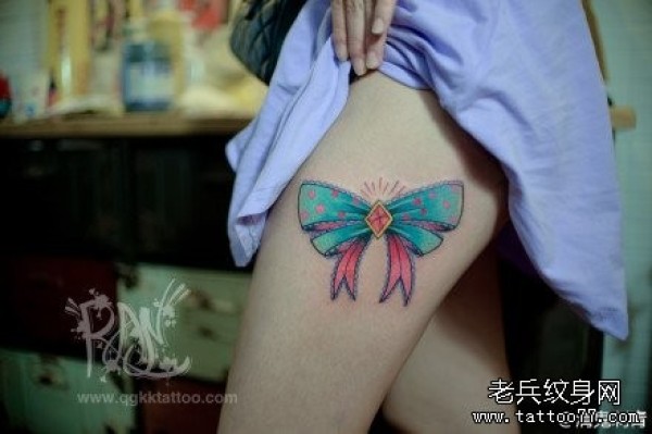 女人大腿处漂亮潮流的蝴蝶结纹身图片_蝴蝶纹身图案大全_纹身图吧