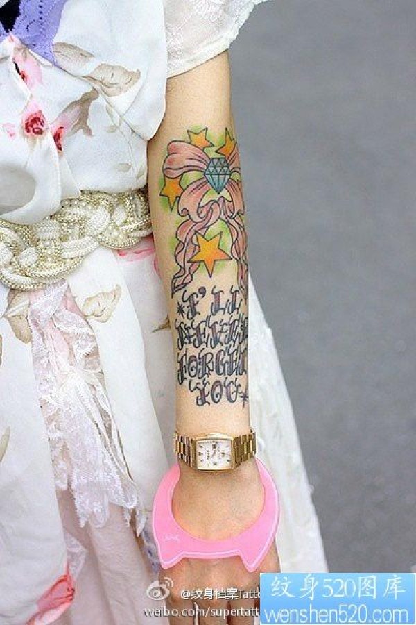 女性手臂蝴蝶结字母纹身图案_蝴蝶纹身图案大全_纹身图吧