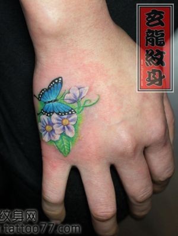 美女手背彩色蝴蝶花卉纹身图片_蝴蝶纹身图案大全_纹身图吧