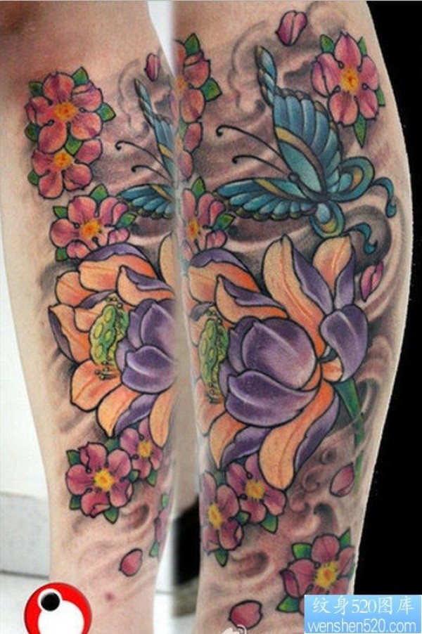 一幅小腿莲花蝴蝶樱花纹身图片由纹身520图库推_蝴蝶纹身图案大全_纹身图吧
