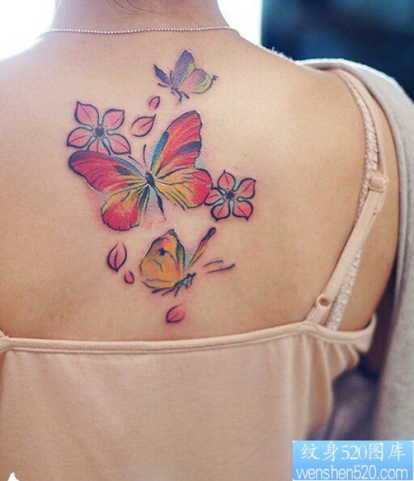 女性背部水彩蝴蝶樱花纹身图案_蝴蝶纹身图案大全_纹身图吧