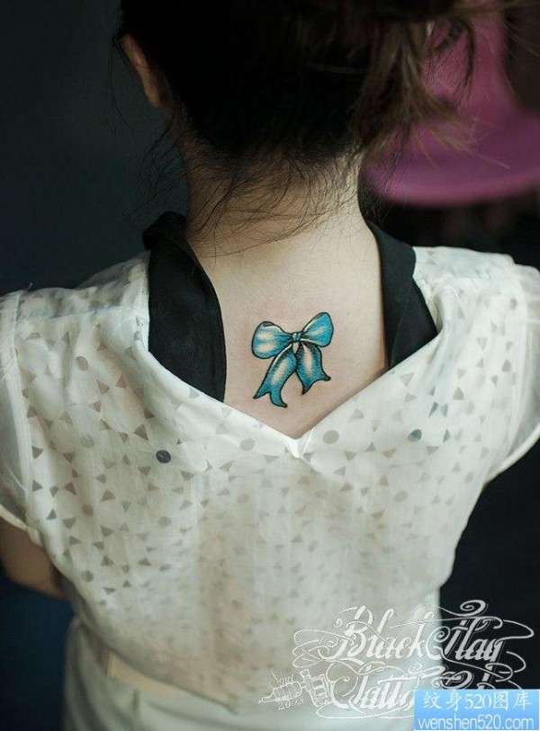 一幅女人颈部小清新蝴蝶结纹身图片有_蝴蝶纹身图案大全_纹身图吧