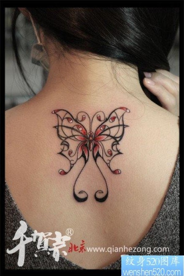 女人后背时尚小巧的蝴蝶纹身图片_蝴蝶纹身图案大全_纹身图吧