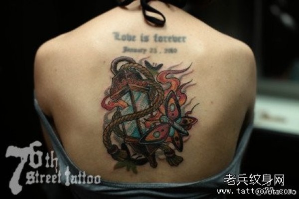 女人后背时尚经典的油灯蝴蝶纹身图片_蝴蝶纹身图案大全_纹身图吧
