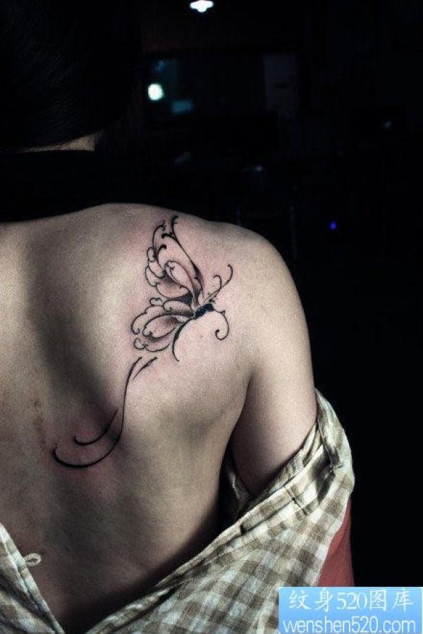 美女肩背唯美经典的黑灰蝴蝶纹身图片_蝴蝶纹身图案大全_纹身图吧