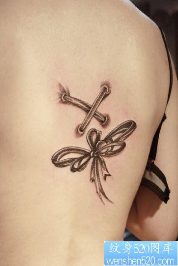 美女背部精美的蝴蝶结纹身图片_蝴蝶纹身图案大全_纹身图吧