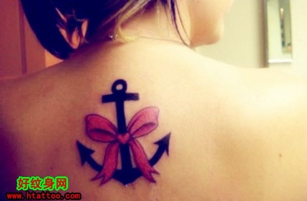 女生背部彩色蝴蝶结锚欧美个性纹身_蝴蝶纹身图案大全_纹身图吧