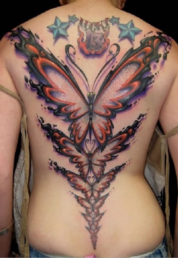 美女后背大型的彩色蝴蝶纹身图案非常艳丽的纹_蝴蝶纹身图案大全_纹身图吧