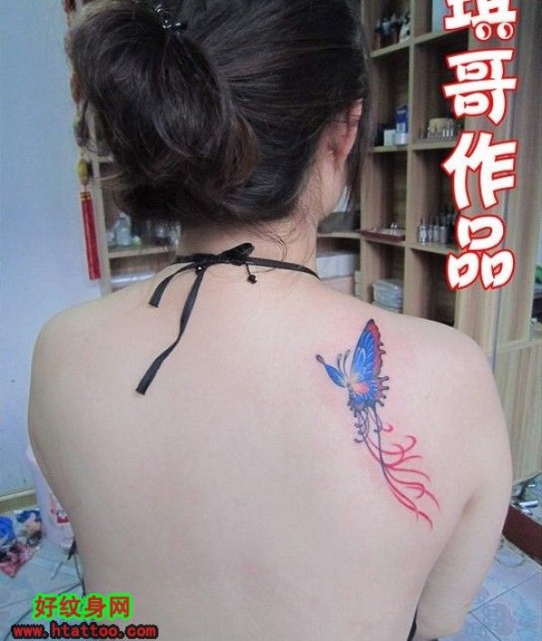 美女背部的彩色蝴蝶小图腾纹身_蝴蝶纹身图案大全_纹身图吧