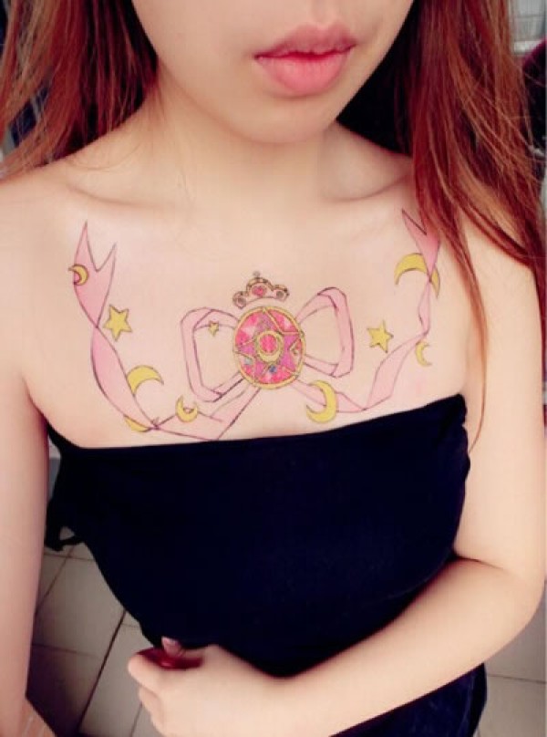女生胸前漂亮的彩带纹身图粉红色的彩带蝴蝶结_蝴蝶纹身图案大全_纹身图吧