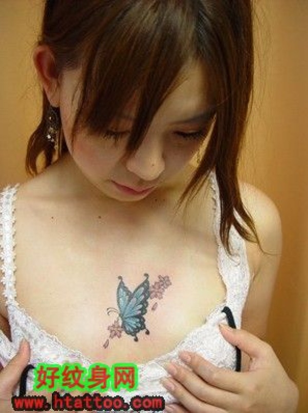 美女胸部彩色的蝴蝶年轻人的首选刺青图案_蝴蝶纹身图案大全_纹身图吧
