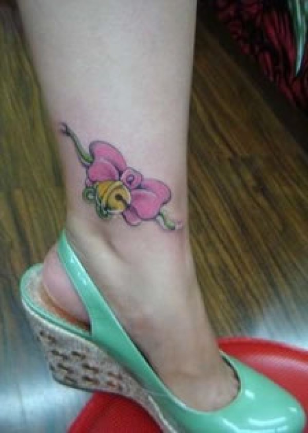 小腿脚裸处粉红色蝴蝶结纹身图案美女脚裸上带_蝴蝶纹身图案大全_纹身图吧
