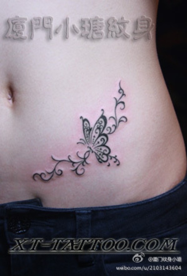 女孩子腹部精美好看的图腾蝴蝶藤蔓纹身图案_蝴蝶纹身图案大全_纹身图吧
