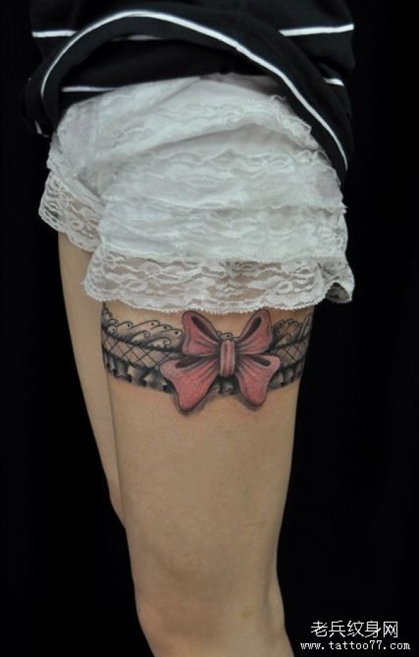 女孩子腿部时尚精美的蕾丝与蝴蝶结纹身图案_蝴蝶纹身图案大全_纹身图吧