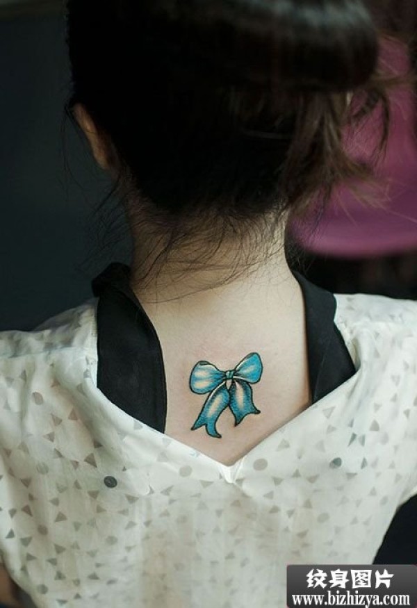 蓝色蝴蝶结后颈纹身图案图片_蝴蝶纹身图案大全_纹身图吧