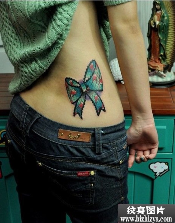 侧腰蓝色蝴蝶结刺青图案图片_蝴蝶纹身图案大全_纹身图吧