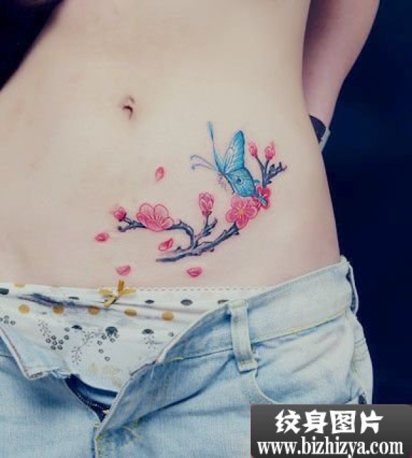 蝴蝶桃花时尚腰部纹身图案图片_蝴蝶纹身图案大全_纹身图吧