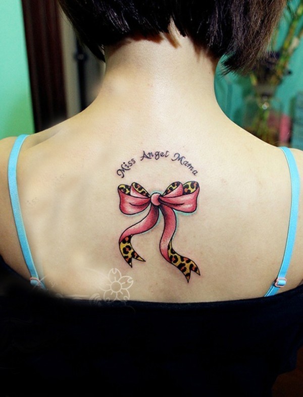 一款女性后背彩色蝴蝶结文字纹身图案由武汉纹_蝴蝶纹身图案大全_纹身图吧