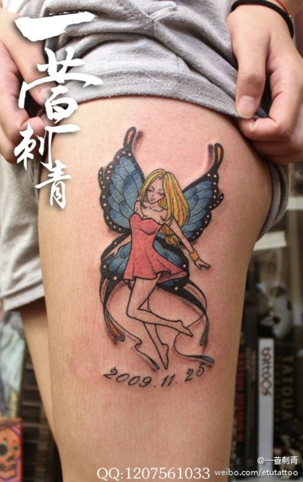腿部时尚漂亮的蝴蝶精灵纹身图案_蝴蝶纹身图案大全_纹身图吧
