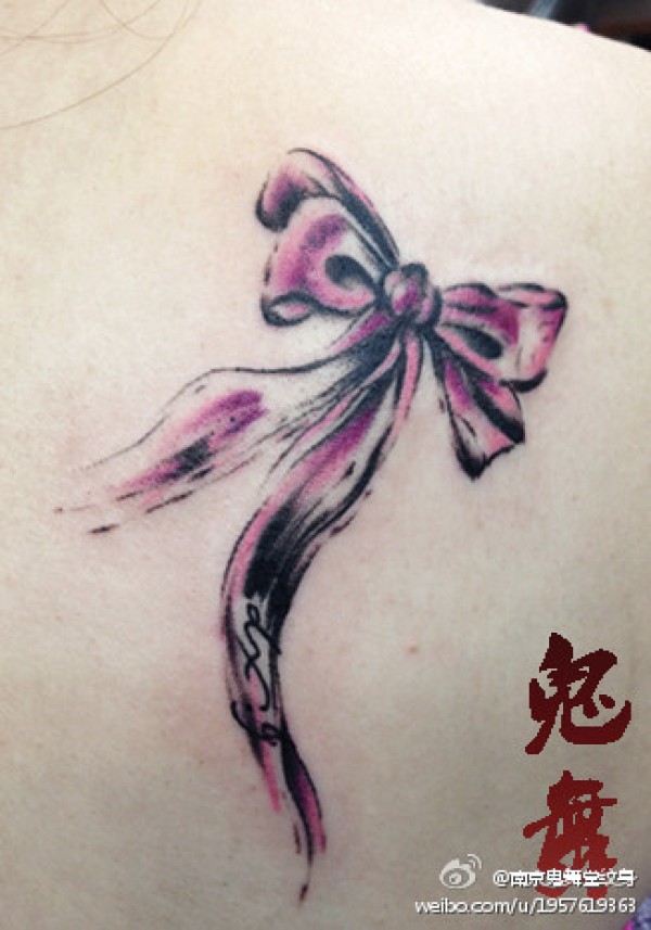 女生肩背唯美潮流的写意蝴蝶结纹身图案_蝴蝶纹身图案大全_纹身图吧